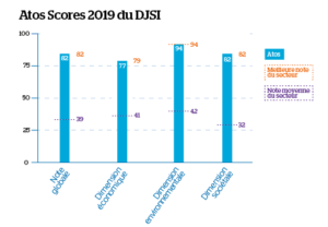 En 2019, Atos mantiene su posición de liderazgo en el sector de servicios de TI y software al encabezar por segundo año consecutivo el ranking de este estudio global basado en la evaluación anual de 3.500 empresas cotizadas. Con un total de 82 puntos sobre 100 – una mejora de 4 puntos en comparación con 2018 – Atos ocupa el primer lugar en su sector entre otras 65 compañías globales de TI. Atos demuestra excelencia en su desempeño en las 3 categorías evaluadas: medio ambiente, economía y social, y, por primera vez, obtiene a mejor puntuación del sector en las dimensiones sociales y medioambientales.